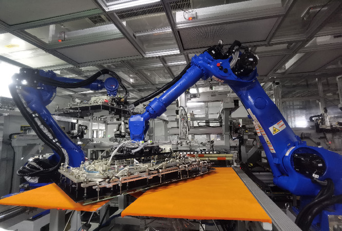 在海信視像智能車間的生產(chǎn)線上,機(jī)器人對液晶面板和背光板自動(dòng)化精準(zhǔn)卡合。記者 王凱 攝