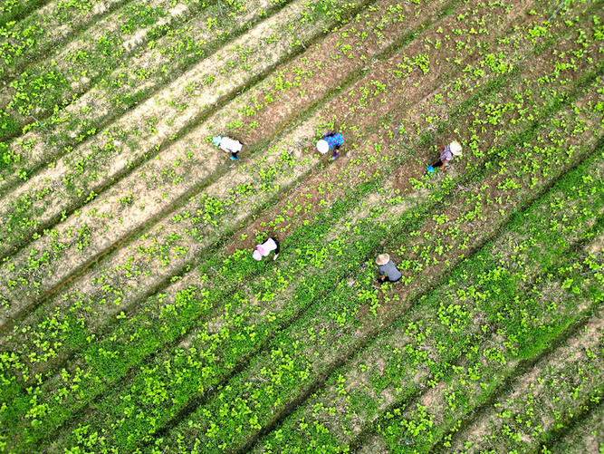 秋日里,農(nóng)民忙著秋收秋管,鄉(xiāng)村田野一派繁忙景象。圖為9月26日村民在貴州省黔東南苗族侗族自治州榕江縣車江壩區(qū)蔬菜基地進行田間管理(無人機照片)。