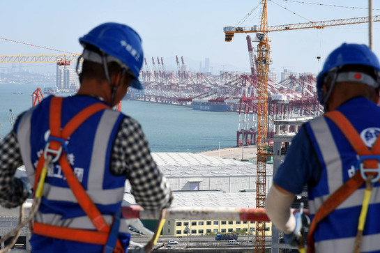 國慶長假期間,在位于中國(山東)自由貿(mào)易試驗區(qū)青島片區(qū)的航運貿(mào)易金融融合創(chuàng)新基地項目上,600多名建設(shè)者堅守一線,搶抓施工黃金期,奮力沖刺項目建設(shè)關(guān)鍵節(jié)點。圖為中鐵建工建設(shè)者在進行外墻吊裝施工準備。新華社記者 李紫恒 攝