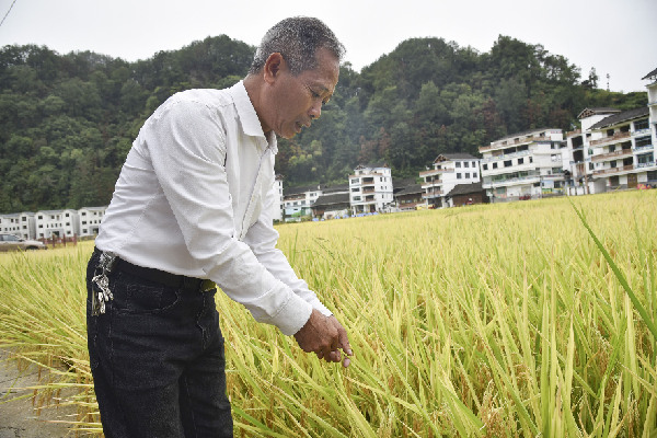 臺江縣農業(yè)農村局農業(yè)技術推廣站技術指導員熊仁友了解陽芳村種植的優(yōu)質水稻生長情況。