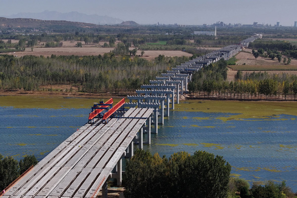 圖為工人在唐山灤州市內(nèi)的秦唐高速公路跨灤河大橋建設(shè)工地施工(無人機照片)。