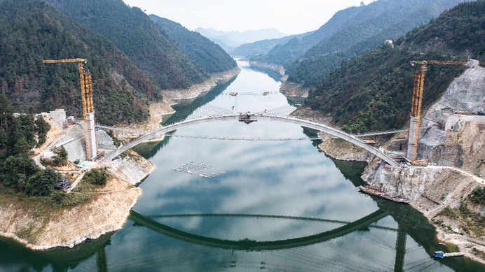 10月23日,貴州路橋集團承建的錫繡大橋主拱圈順利合龍(無人機照片)。錫繡大橋位于貴州省黔東南苗族侗族自治州劍河縣境內(nèi),是附近鄉(xiāng)鎮(zhèn)群眾橫跨清水江三板溪庫區(qū)的快捷通道,橋梁建成后將極大縮短兩岸往來的通行時間。