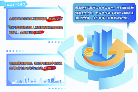 繼續(xù)對小規(guī)模納稅人減免增值稅、優(yōu)化研發(fā)費(fèi)用加計扣除政策、先進(jìn)制造企業(yè)增值稅加計抵減……今年以來,相關(guān)部門分批次延續(xù)、優(yōu)化和完善近70項稅費(fèi)優(yōu)惠政策,有力激發(fā)經(jīng)營主體活力,提升創(chuàng)新發(fā)展動能。國家稅務(wù)總局最新數(shù)據(jù)顯示,今年1至10月份,全國新增減稅降費(fèi)及退稅緩費(fèi)16607億元,其中民營經(jīng)濟(jì)納稅人成稅費(fèi)優(yōu)惠政策主要受益對象,金額占比近75%;創(chuàng)新主體受益明顯,前三季度提前享受研發(fā)費(fèi)用加計扣除政策的企業(yè)達(dá)40.3萬戶。