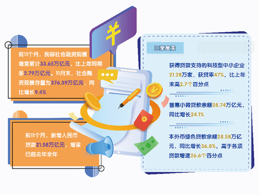 12月13日人民銀行披露的數(shù)據(jù)顯示,前11個(gè)月,我國(guó)社會(huì)融資規(guī)模增量累計(jì)33.65萬(wàn)億元,比上年同期多2.79萬(wàn)億元。與此同時(shí),前11個(gè)月貸款增量達(dá)21.58萬(wàn)億元,已超去年全年。在貨幣政策總量和結(jié)構(gòu)性工具合力支持下,金融助力實(shí)體經(jīng)濟(jì)恢復(fù)向好,科技創(chuàng)新、綠色低碳等重點(diǎn)領(lǐng)域企業(yè)資金“獲得感”也有所增強(qiáng)。