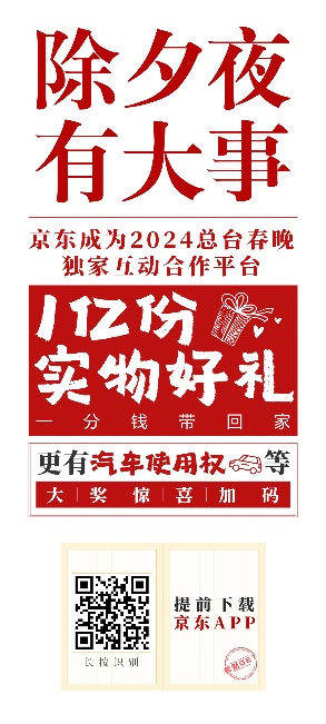 2月9日除夕夜,備受全球華人期待的中央廣播電視總臺《2024年春節(jié)聯(lián)歡晚會》(簡稱“總臺春晚”)將正式與觀眾見面。作為總臺春晚獨家互動合作平臺,京東在攜手中央廣播電視總臺為全球華人帶來“文化年夜飯”的同時,也將為海內(nèi)外觀眾送上1億份實物好禮,更有汽車使用權(quán)等驚喜大獎數(shù)量再次加碼!與全球華人共同迎接甲辰龍年的到來。