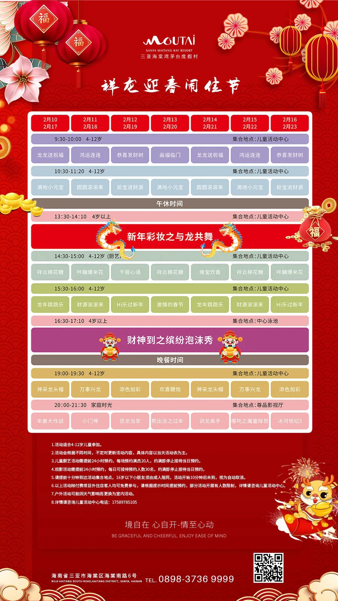 ????據(jù)悉,春節(jié)期間,茅臺度假村還將全天在酒店內的兒童活動中心、中心泳池、尊品影視廳固定開展“祥龍迎春鬧佳節(jié)”主題活動,活動類別豐富、花樣百出,既有傳統(tǒng)文化體驗,更有親子歡樂互動,活動時間將持續(xù)至大年十五元宵節(jié)。