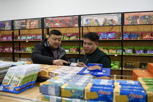 巴吾江·賽別克(左)在查看剛運(yùn)到的進(jìn)口食品(1月16日攝)。記者 趙戈 攝