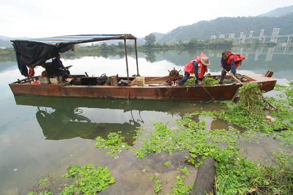 在閩江上游富屯溪福建省南平市順昌縣埔上鎮(zhèn)口前村河段,工作人員駕船打撈河面上的漂浮物。新華社發(fā) (陳柏材 攝)