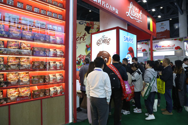 在10號館進(jìn)口食品展區(qū),比利時(shí)國家(商品)館邀請了一家比利時(shí)巧克力廠設(shè)立展位?!斑@里的人真的非常多。比利時(shí)是以巧克力、啤酒、鉆石和藍(lán)精靈聞名的國家,而我們是唯一能使用藍(lán)精靈IP的巧克力廠家,所以大家對我們的產(chǎn)品非常感興趣?!边@家比利時(shí)巧克力廠的負(fù)責(zé)人莉莉·利比特表示。