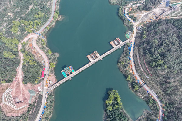 位于重慶市銅梁區(qū)的成渝中線(xiàn)高鐵玄天湖大橋建設(shè)現(xiàn)場(chǎng)(無(wú)人機(jī)照片)。