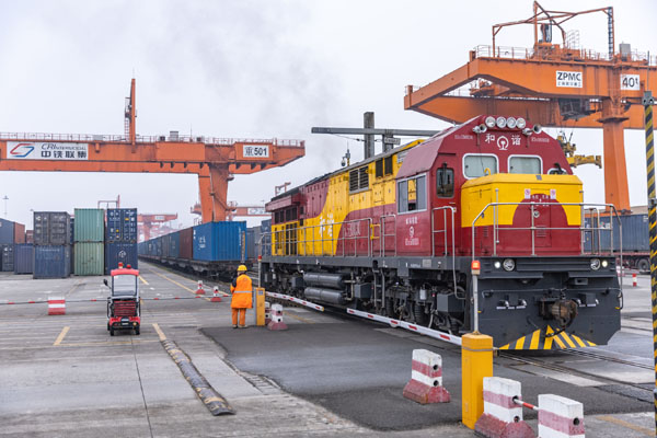 一列滿(mǎn)載機(jī)械設(shè)備、整車(chē)及零部件等貨物的中歐班列在重慶團(tuán)結(jié)村中心站等候發(fā)車(chē)。記者 黃偉 攝