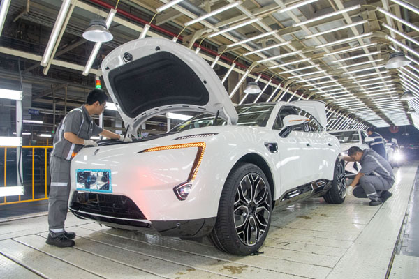“重慶造”新能源汽車(chē)加速走向國(guó)內(nèi)外市場(chǎng)。在位于重慶市江北區(qū)的長(zhǎng)安汽車(chē)生產(chǎn)基地車(chē)間內(nèi),工作人員在新能源汽車(chē)阿維塔生產(chǎn)線(xiàn)上作業(yè)。記者 唐奕 攝