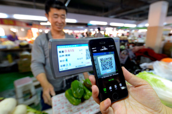 在河北省邯鄲市一家便民市場(chǎng),消費(fèi)者在掃碼支付購(gòu)買(mǎi)蔬菜。