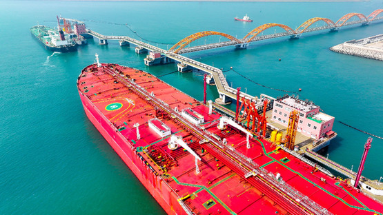 圖為在山東港口日照港嵐山港區(qū)30萬噸級油品碼頭,船舶??窟M(jìn)行卸油作業(yè)(無人機(jī)照片)?!⌒氯A社記者 郭緒雷 攝