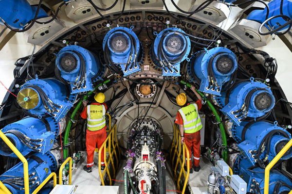 近日,由中鐵十一局承建的深江鐵路深莞隧道西段“鯤鵬號(hào)”盾構(gòu)機(jī)順利始發(fā)。該段是13米級(jí)大直徑單洞雙線隧道,線路埋深跨度在9至62米。深江鐵路是我國“八縱八橫”高鐵網(wǎng)沿海通道的重要組成部分,線路起自深圳西麗站,正線全長116公里,跨越珠江口,串聯(lián)深圳、東莞、廣州、中山和江門等5座城市。該工程建成后,深圳與江門可實(shí)現(xiàn)1小時(shí)內(nèi)通達(dá),深圳與廣州南沙自貿(mào)片區(qū)可實(shí)現(xiàn)半小時(shí)高鐵互聯(lián)互通。圖為施工人員在檢查“鯤鵬號(hào)”盾構(gòu)機(jī)刀頭組件運(yùn)行狀況。