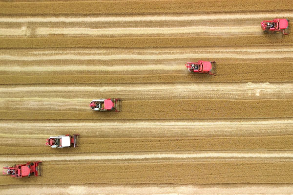 麥浪翻滾,沃野生金。麥田中,10臺收割機(jī)依次排開;一聲令下,農(nóng)機(jī)手駕駛收割機(jī)勻速前行,風(fēng)中搖曳的麥穗被吸入“腹中”,田間只剩下短短的麥茬。