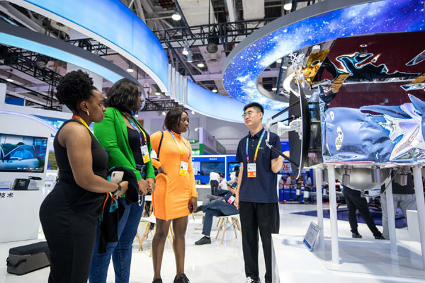 5月31日,參展商(右一)在博覽會(huì)上向觀眾介紹“天都一號(hào)”通導(dǎo)技術(shù)試驗(yàn)衛(wèi)星。記者 陳思汗 攝