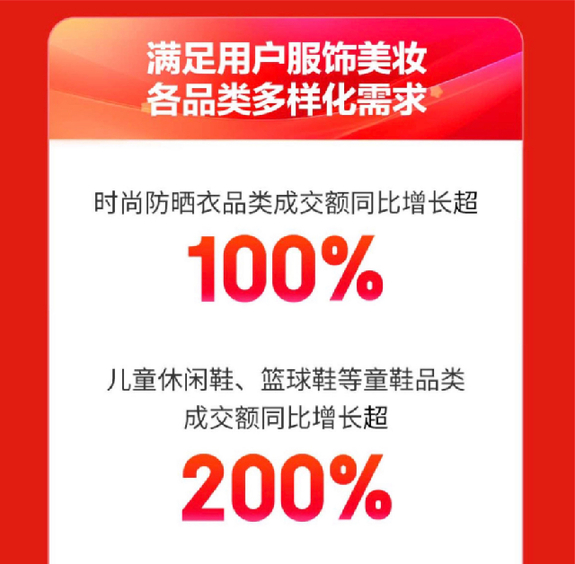 值得一提的是,京東618開門紅契合熱門消費節(jié)點,也帶動相關(guān)品類迎來了銷量小高峰。隨著“六一”國際兒童節(jié)來臨,童裝童鞋品類順勢爆發(fā),耐克(NIKE)兒童成交額同比增長超5倍。兒童休閑鞋、籃球鞋等童鞋品類成交額同比增長超200%;而滿足消費者夏日穿衣怕熱怕曬需求,時尚防曬衣品類成交額同比增長100%,洞洞鞋成交額同比增長超100%。又便宜又好的反季品類也受到消費者追捧,京東618開門紅4小時,皮衣、毛呢等品類成交額同比增長超過5倍。