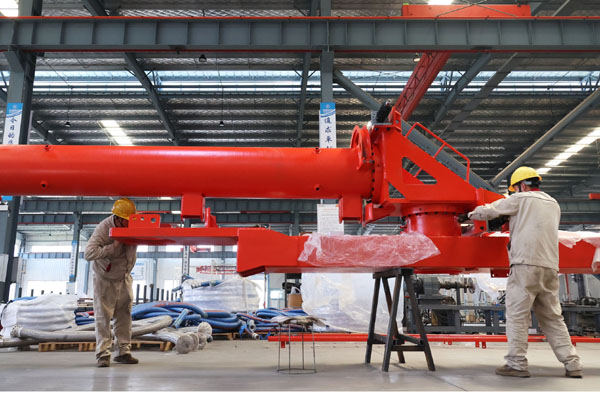 5月27日,江蘇連云港海州經(jīng)濟(jì)開發(fā)區(qū)新浦工業(yè)園一家企業(yè)的工人在組裝一臺流體裝卸臂。新華社發(fā) 耿玉和 攝