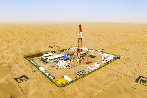 6月14日拍攝的中國石化西北油田一油井鉆井現(xiàn)場(無人機(jī)照片)。 新華社發(fā)(李學(xué)仁 攝)