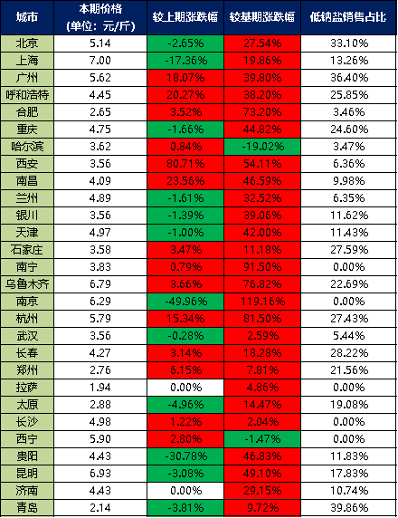 分價(jià)格區(qū)間來看,本期超市食用鹽銷售單價(jià)在5元/斤以上的城市有8個(gè),分別是北京、上海、廣州、烏魯木齊、南京、杭州、西寧、昆明;超市食用鹽銷售單價(jià)在4-5元/斤之間的城市有9個(gè),分別是呼和浩特、重慶、南昌、蘭州、天津、長春、長沙、貴陽、濟(jì)南;超市食用鹽銷售單價(jià)在3-4元/斤之間的城市有6個(gè),分別是哈爾濱、西安、銀川、石家莊、南寧、武漢;超市食用鹽銷售單價(jià)在3元/斤以下的城市有5個(gè),分別是合肥、鄭州、拉薩、太原、青島。