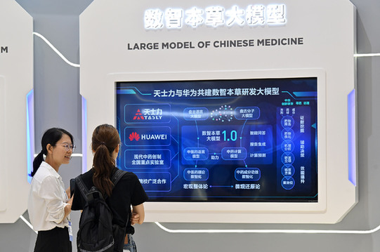 觀眾在2024世界智能產(chǎn)業(yè)博覽會上的天士力展區(qū)了解數(shù)智本草大模型?!∮浾摺±钊弧z