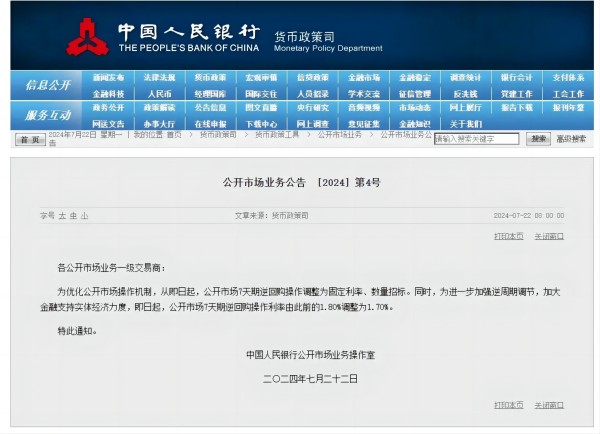 7月22日,央行發(fā)布公開市場(chǎng)業(yè)務(wù)公告,宣布即日起公開市場(chǎng)7天期逆回購(gòu)操作采用固定利率、數(shù)量招標(biāo),操作利率由1.8%調(diào)整為1.7%。