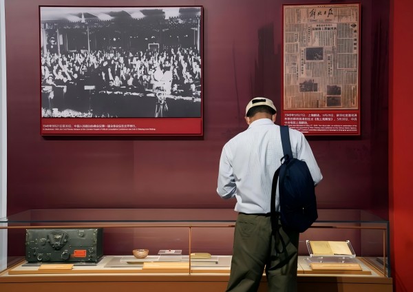 ??展柜左側(cè),開國大典的影像資料反復(fù)播放,“中華人民共和國中央人民政府今天成立了!”天安門城樓上面向全世界的宣告,久久回蕩。
