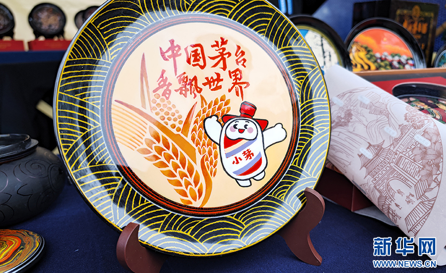 10月11日,以貴州大方漆器工藝制作的茅臺“小茅”形象漆器圓盤。新華網(wǎng) 盧志佳 攝