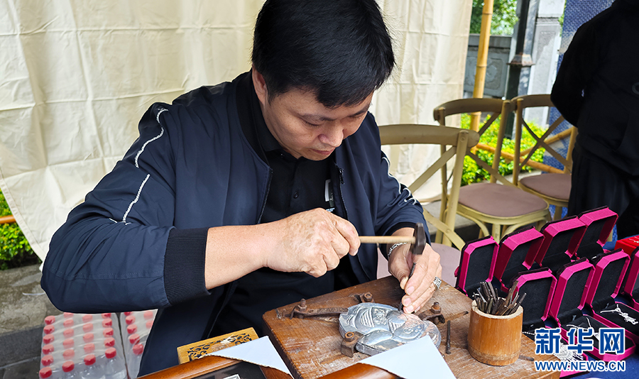10月11日,貴州苗族銀飾非遺傳承人在茅臺酒節(jié)用銀鍛造茅臺“小茅”形象。新華網(wǎng) 盧志佳 攝