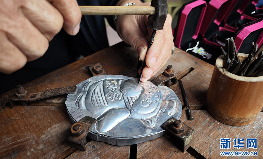 10月11日,貴州苗族銀飾非遺傳承人在茅臺酒節(jié)用銀鍛造茅臺“小茅”形象。新華網(wǎng) 盧志佳