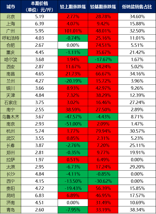 低鈉鹽銷售方面,8月份超市渠道銷售低鈉鹽占比超過15%的城市為北京、上海、廣州、重慶、南昌、石家莊、杭州、長春、鄭州、太原、貴陽、昆明、青島。