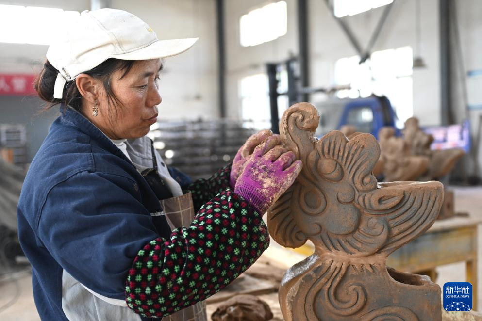 10月30日,在固原市隆德縣魏氏磚雕傳承基地,卜文?。ㄓ遥┰谏a(chǎn)車間對工人進(jìn)行指導(dǎo)。