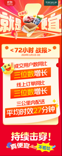 11月1日,京東七鮮超市正式開啟的“超級(jí)擊穿”活動(dòng),以“真便宜不怕比”的極致低價(jià)成功吸引海量消費(fèi)者參與。僅72小時(shí),線上訂單數(shù)、成交用戶數(shù)均實(shí)現(xiàn)同比三位數(shù)增長,水果、蔬菜、水產(chǎn)、肉禽蛋等多品類的爆款賣至脫銷。