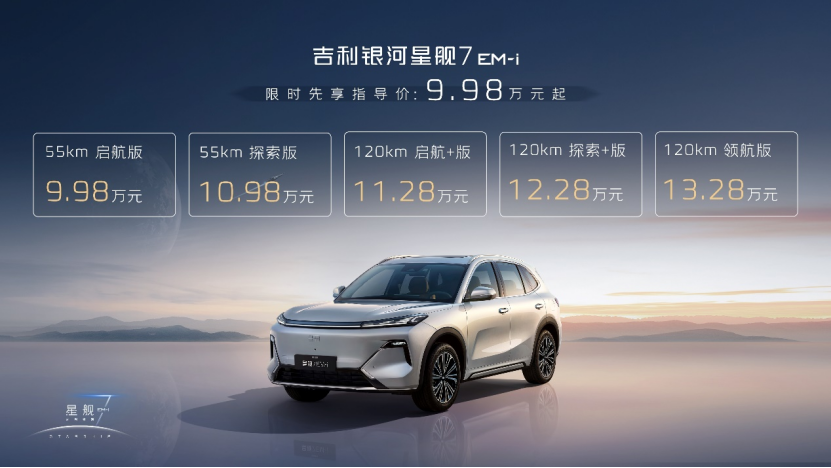 12月6日,吉利銀河全新A級(jí)電混SUV——“新一代國民精品SUV”吉利銀河星艦7EM-i(簡(jiǎn)稱吉利銀河星艦7)在吉利汽車夢(mèng)想啟航的地方——浙江臺(tái)州正式上市。新車共推出五個(gè)版型,分別是120km領(lǐng)航版、120km探索+版、120km啟航+版、55km探索版、55km啟航版,限時(shí)先享指導(dǎo)價(jià)為9.98萬元—13.28萬元。即日起,用戶可通過吉利銀河APP、微信小程序、抖音小程序及官網(wǎng)等官方渠道下訂,下訂用戶可享限時(shí)免費(fèi)享價(jià)值8800元的Flyme Sound無界之聲、限時(shí)免費(fèi)享價(jià)值1200-3000元配置、限時(shí)享8萬24期0息、不限品牌的4000元置換補(bǔ)貼等豐厚購車權(quán)益。