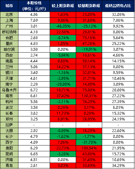 低鈉鹽銷售方面,11月份超市渠道銷售低鈉鹽占比超過(guò)15%的城市為北京、重慶、烏魯木齊、南京、杭州、長(zhǎng)春、鄭州、太原、貴陽(yáng)、昆明、青島。
