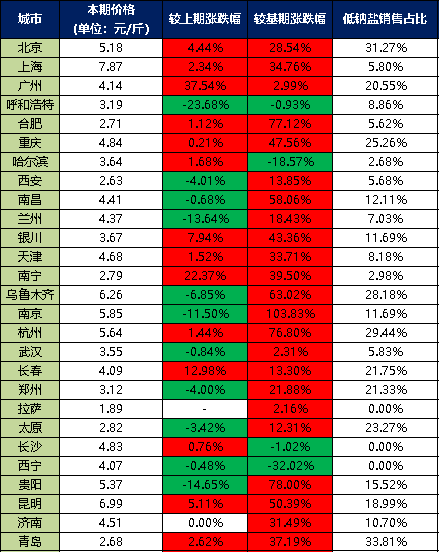 分價格區(qū)間來看,本期超市食用鹽銷售單價在5元/斤以上的城市有7個,分別是北京、上海、烏魯木齊、南京、杭州、貴陽、昆明;超市食用鹽銷售單價在4-5元/斤之間的城市有9個,分別是廣州、重慶、南昌、蘭州、天津、長春、長沙、西寧、濟南;超市食用鹽銷售單價在3-4元/斤之間的城市有5個,分別是呼和浩特、哈爾濱、銀川、武漢、鄭州;超市食用鹽銷售單價在3元/斤以下的城市有6個,分別是合肥、西安、南寧、拉薩、太原、青島。
