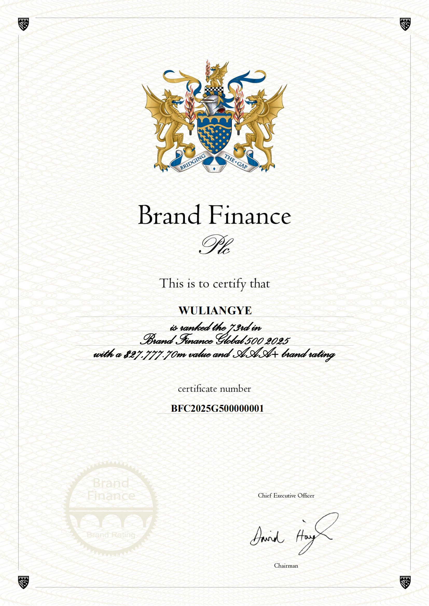 Brand Finance 2025年全球品牌價值500強榜單報告顯示,五糧液品牌強度評級繼續(xù)保持全球最高等級——AAA+級,品牌價值達277.78億美元,同比增長7.27%,排名上升2位至第73名。