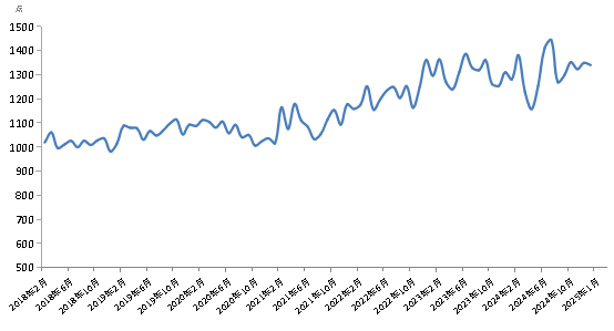 2025年1月份,新華·中鹽食用鹽(商超)價(jià)格指數(shù)報(bào)1340.82點(diǎn),較上期(2024年12月)下跌9.06點(diǎn),跌幅0.67%;較基期(2018年1月)上漲340.82點(diǎn),漲幅34.08%;較周期內(nèi)最高點(diǎn)1445.75點(diǎn)(2024年7月)下跌104.93點(diǎn),跌幅7.43%;較周期內(nèi)最低點(diǎn)981.91點(diǎn)(2018年12月)上漲358.91點(diǎn),漲幅36.55%。