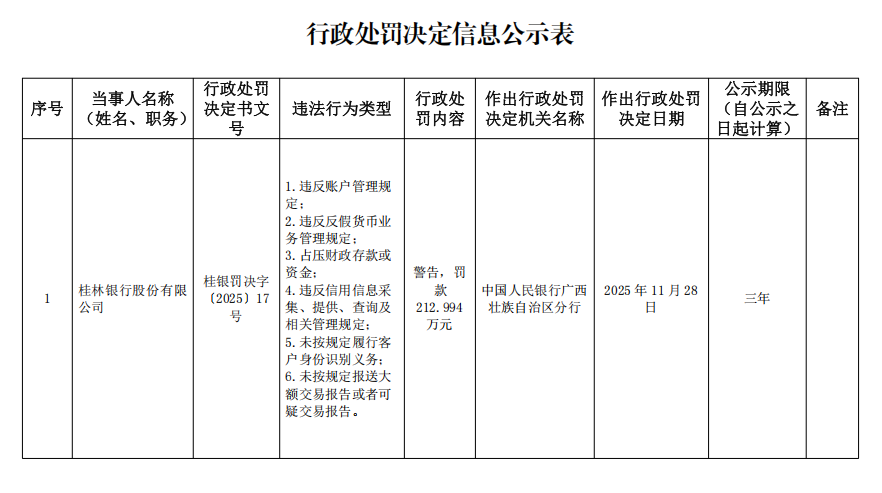 Wind數(shù)據(jù)顯示,2025年三季度以來,桂林銀行已被監(jiān)管點(diǎn)名4次:今年9月,桂林銀行股份有限公司梧州分行因貸款風(fēng)險(xiǎn)分類不準(zhǔn)確、貸后管理不盡職,被國家金融監(jiān)督管理總局梧州監(jiān)管分局罰款50萬元;今年10月,因基金銷售業(yè)務(wù)存在業(yè)務(wù)負(fù)責(zé)人等未取得基金從業(yè)資格,未對宣傳海報(bào)出具合規(guī)意見書以及個(gè)別基金銷售宣傳海報(bào)未突出風(fēng)險(xiǎn)提示等情況,被證監(jiān)會(huì)廣西監(jiān)管局采取出具警示函的行政監(jiān)管措施;11月24日,桂林銀行股份有限公司賀州分行因違反外匯登記管理規(guī)定,被國家外匯管理局賀州市分局罰款5萬元;11月28日,桂林銀行桂林分行因違反外匯登記管理規(guī)定,被國家外匯管理局廣西分局罰款10萬元。