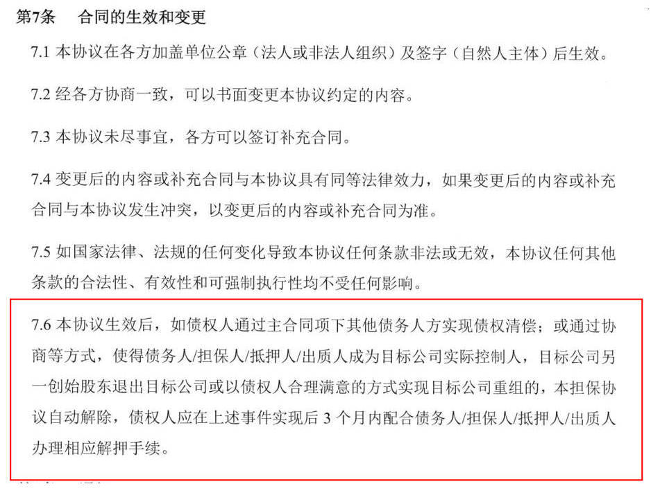 二是合同的生效和變更。該協(xié)議第7.6條載明:該擔(dān)保協(xié)議生效后,如債權(quán)人通過主合同項下其他債務(wù)人方實現(xiàn)債權(quán)清償;或通過協(xié)商等方式,使得債務(wù)人/擔(dān)保人/質(zhì)押人/出質(zhì)人成為目標(biāo)公司(指駿玖電子)實際控制人,目標(biāo)公司另一創(chuàng)始股東退出目標(biāo)公司或以債權(quán)人合理滿意的方式實現(xiàn)目標(biāo)公司重組的,本擔(dān)保協(xié)議自動解除,債權(quán)人應(yīng)在上述事件實現(xiàn)后3個月內(nèi)配合債務(wù)人/擔(dān)保人/質(zhì)押人/出質(zhì)人辦理相應(yīng)解押手續(xù)。