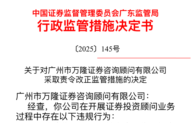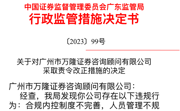 近日,中國證券監(jiān)督管理委員會廣東監(jiān)管局(以下簡稱“中國證監(jiān)會廣東監(jiān)管局”)官網(wǎng)發(fā)布行政監(jiān)管措施決定書,廣州市萬隆證券咨詢顧問有限公司(以下簡稱“萬隆證券”)被采取責(zé)令改正監(jiān)管措施。