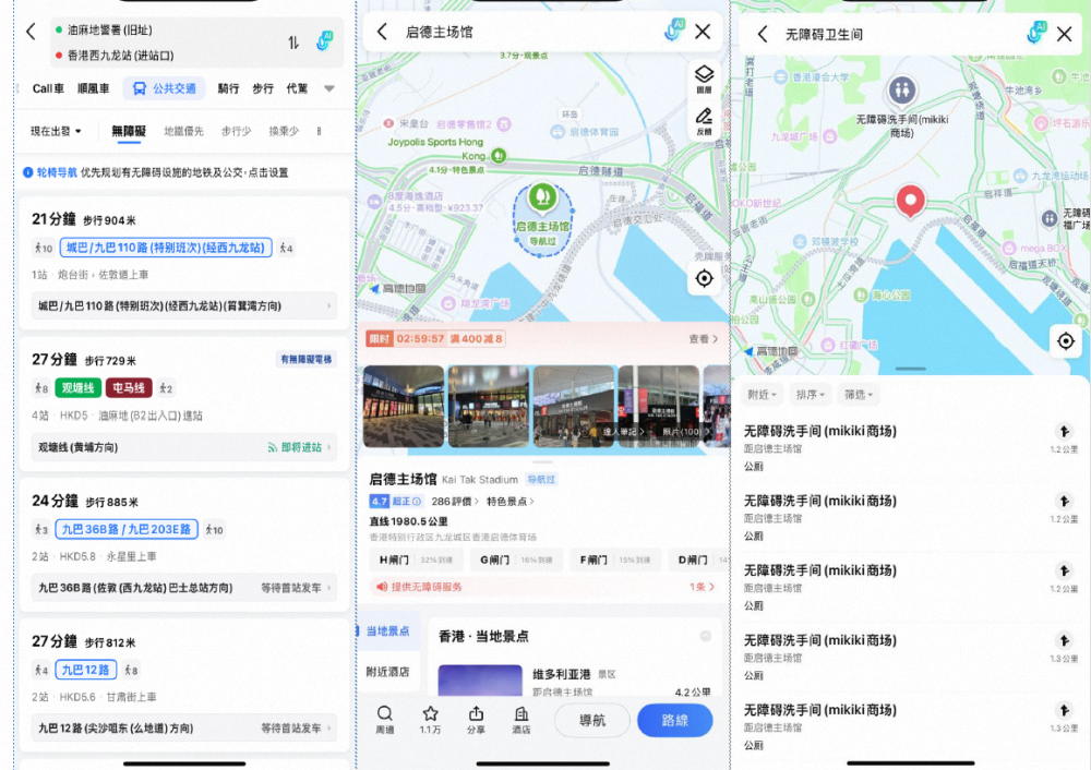 針對香港出行場景的特殊性,高德無障礙導(dǎo)航進行了精準適配與資源整合。目前已上線1000余條無障礙巴士線路,收錄數(shù)千個無障礙設(shè)施點位,涵蓋無障礙直梯、無障礙洗手間、無障礙通道等核心公共設(shè)施,同時覆蓋90余個重要場所,包括賽事場館、交通場站、酒店及購物中心等,用戶通過高德App搜索,即可一鍵查詢這些場所的無障礙出入口、設(shè)施分布等關(guān)鍵信息。在導(dǎo)航體驗上,用戶開啟“無障礙模式”后,系統(tǒng)將自動優(yōu)先推薦配備無障礙直梯、升降機的地鐵及有無障礙設(shè)施的公交路線。