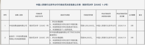 據(jù)處罰信息顯示,中信消金本次涉及的違法行為包括異議處理超期、未按規(guī)定對(duì)異議進(jìn)行書面回復(fù)、未按規(guī)定對(duì)異議信息進(jìn)行標(biāo)注、未準(zhǔn)確報(bào)送個(gè)人信用信息。對(duì)于上述違法行為,中國(guó)人民銀行北京市分行對(duì)其罰款105萬(wàn)元。