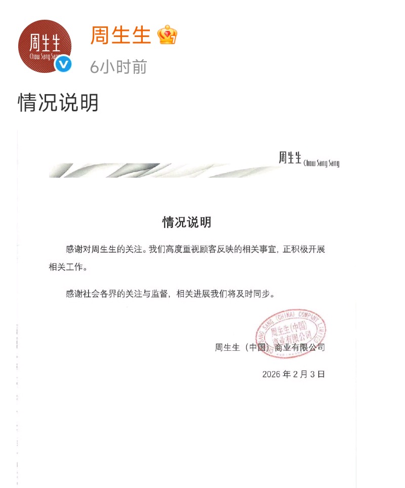 記者注意到,2月3日,“周生生”微博發(fā)布一則情況說(shuō)明顯示:“感謝對(duì)周生生的關(guān)注。我們高度重視顧客反映的相關(guān)事宜,正積極開(kāi)展相關(guān)工作。感謝社會(huì)各界的關(guān)注與監(jiān)督,相關(guān)進(jìn)展我們將及時(shí)同步。”