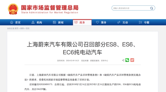 召回編號S2026M0017I:自即日起,召回2018年3月16日至2023年1月16日期間生產的ES8、ES6和EC6純電動汽車,共計246229輛。