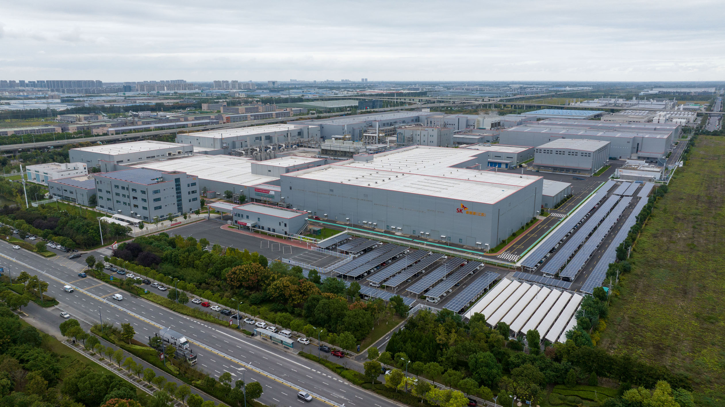 位于中韓(鹽城)產(chǎn)業(yè)園內的SK新能源一期動力電池生產(chǎn)基地(無人機照片)。新華社記者 李博 攝