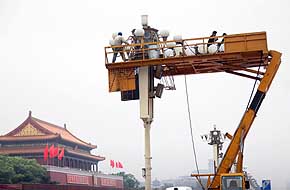 工人乘坐升降車(chē)為北京天安門(mén)城樓西側(cè)的華燈更換新型節(jié)能光源。新華社發(fā) | “雖然去年節(jié)能減排任務(wù)沒(méi)能完成,但從某個(gè)角度來(lái)看,卻體現(xiàn)了政府執(zhí)政能力的進(jìn)步,至少是勇于提出挑戰(zhàn),直面問(wèn)題。”全國(guó)人大代表、皇明太陽(yáng)能集團(tuán)有限公司董事長(zhǎng)黃鳴表示,“敢于直面問(wèn)題才會(huì)有所突破。溫總理已經(jīng)在政府工作報(bào)告中表示,今年要把節(jié)能降耗、保護(hù)環(huán)境和集約用地作為轉(zhuǎn)變經(jīng)濟(jì)增長(zhǎng)方式的突破口和重要抓手,由此可見(jiàn),2007年的節(jié)能減排將成為經(jīng)濟(jì)工作的重中之重,也是關(guān)系到整個(gè)‘十一五’期間節(jié)能減排指標(biāo)能否順利實(shí)現(xiàn)的關(guān)鍵之所在! “政府工作報(bào)告中對(duì)節(jié)能減排給予了高度重視,這是此前從未有過(guò)的!弊叱鋈嗣翊髸(huì)堂,來(lái)自香港特別行政區(qū)的全國(guó)人大代表王英偉這樣告訴記者,“從溫總理的政府工作報(bào)告中,我們可以深切的體會(huì)到,國(guó)家已經(jīng)認(rèn)識(shí)到了節(jié)能減排的重要性,如果高耗能、高排放的情況不能盡快改善,我國(guó)在今后的發(fā)展中就會(huì)遇到很多瓶頸,從而對(duì)國(guó)家的進(jìn)一步發(fā)展造成很大制約! 王英偉表示,盡管政府在節(jié)能減排方面有很大決心,但2007年的節(jié)能減排任務(wù)仍相當(dāng)艱巨!皽乜偫碓谡ぷ鲌(bào)告中指出了今年節(jié)能環(huán)保方面的八個(gè)重點(diǎn),但這些想法一定要落實(shí)到地方政府,希望地方政府能夠加大力度去執(zhí)行,這是節(jié)能減排任務(wù)能否完成的關(guān)鍵!