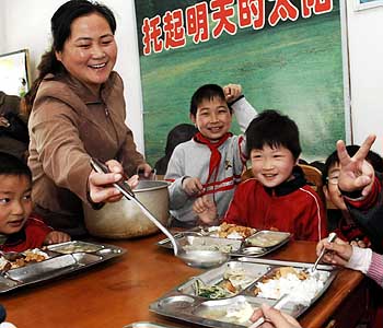 合肥市下崗工人羅莉莉(左二)在給孩子們盛菜。羅莉莉在當(dāng)?shù)亟值赖膸椭麻_辦了一家餐館。新華社發(fā) |