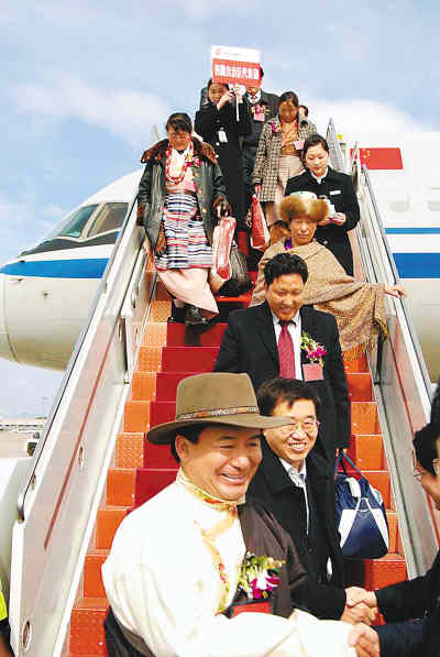 肩負著各族人民的重托,3月2日上午,西藏代表團成員抵達北京,在首都國際機場受到熱烈歡迎。徐錦庚 攝 |